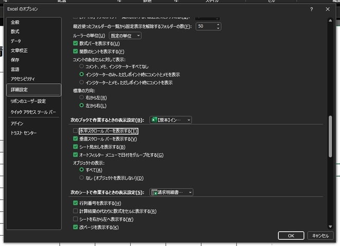 「Excelの水平スクロールバーが消えた?!」と慌ててオプションの詳細設定を確認してしまった💦